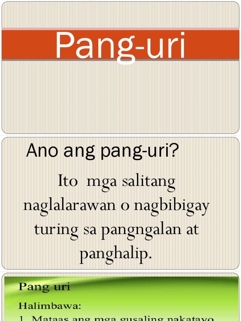 PANG-URI Sa aralin ngayon ating matutunghayan kung ano ang kahulugan halimbawa uri kaantasan kayarian kailanan at gamit ng pang-uri TagalogIto ay kinalap mula sa mga makatang Pilipino na siyang nagpasalin-salin ng mga kahulugan at halimbawa ng pang-uri hanggang sa ngayon. Pasukdol kung nagpapahayag ng kasukdulan ng paghahambing ng higit sa dalawang. Ang pang-uri ay tinatawag na adjectives sa wikang ingles.