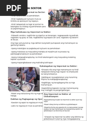 Scribd is the worlds largest social reading and publishing site. Sinasalo nito ang mga mamamayan na hindi makapasok bilang mga regular na empleyado sa isang kompanya 2. Mga epekto ng impormal na sektor ng ekonomiya 4.