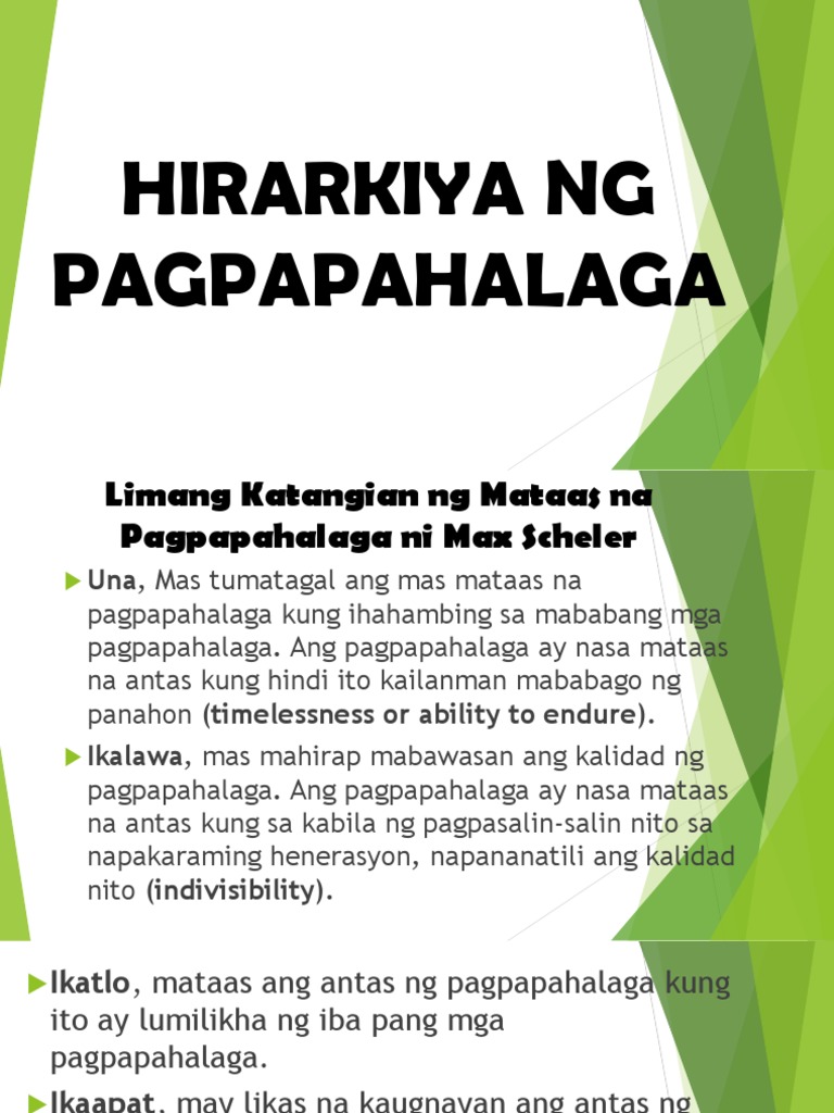 Ang Hirarkiya ng Pagpapahalaga ayon kay Max Scheler Dy M. Pagbabalik-aral Ano ang pamantayan ng pagpapahaaga. Ito ang pinakamataas sa lahat ng antas ng mga pagpapahalaga.