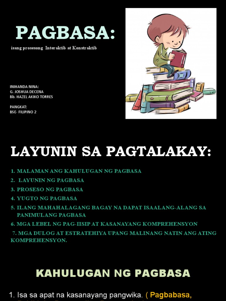 Ang pagbasa ay isang mahalagang aspeto ng wika ay isa sa apat na kasanayang pangwikakabilang ang pakikinigpagsasalitapagsulat at pagbasa pamamagitan ng pagbasa ay nakatutuklas ang tao ng kaalamannapapalawak ang pananawnakakapagdala sa isang tao sa ibat-ibang larangan at nakapagdudulot ng kasiyahan sa isang tao ngunitsa kabilang. Reaksyon sa kahulugan o kabaligtaran nito batay sa kaalaman. Pascua Angel Kaye C.